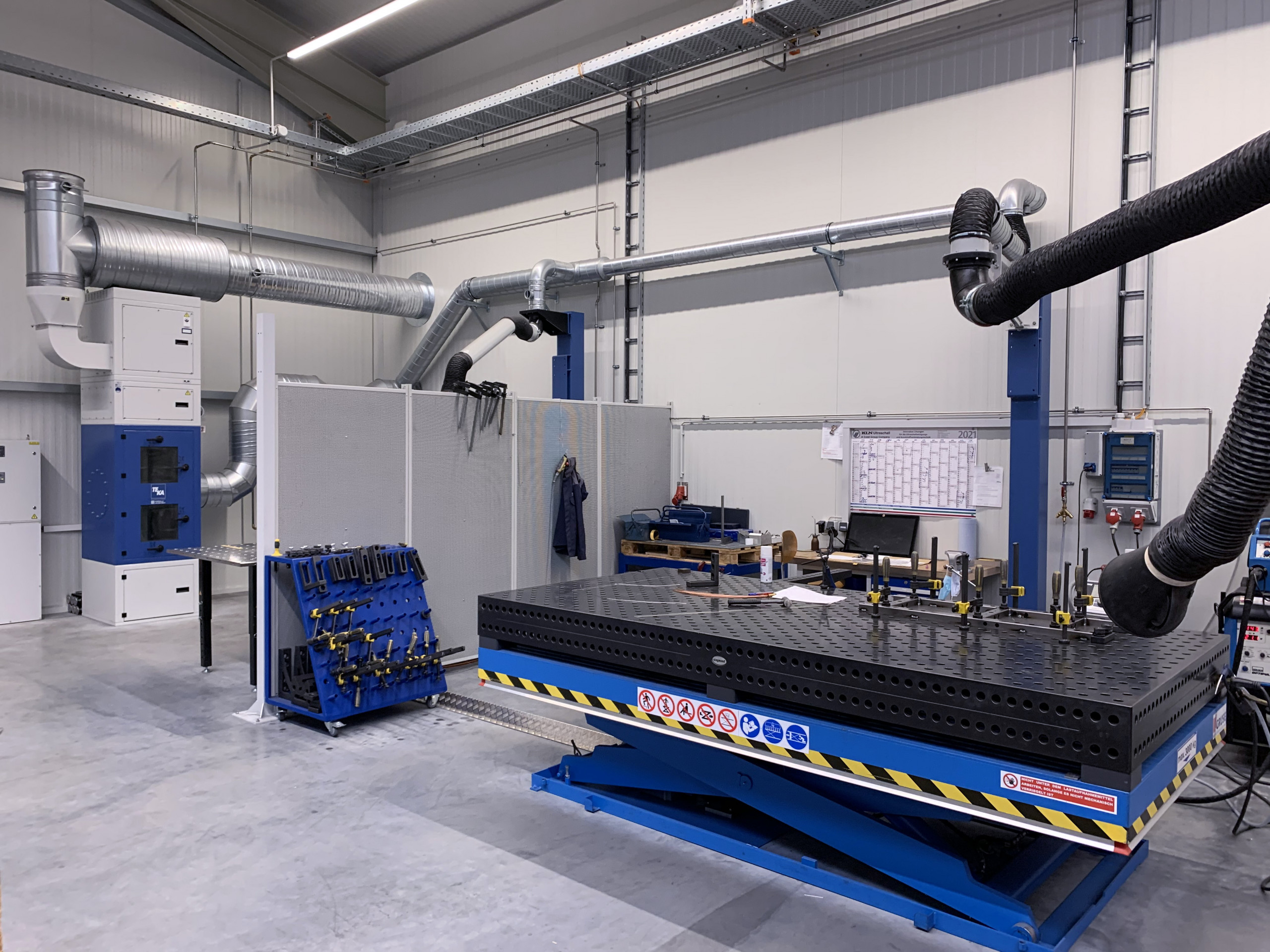 The order of the day was therefore flexibility – both in terms of the design of the welding and grinding stations and the associated extraction technology, which Teka Absaug- und Entsorgungstechnologie planned and implemented in close cooperation with its long-standing trading partner Martin Kratzer Schweiss- und Industriebedarf GmbH from Faulbach (Germany). The latter was the contact person for all questions of the customer on site and also carried out the complete installation.