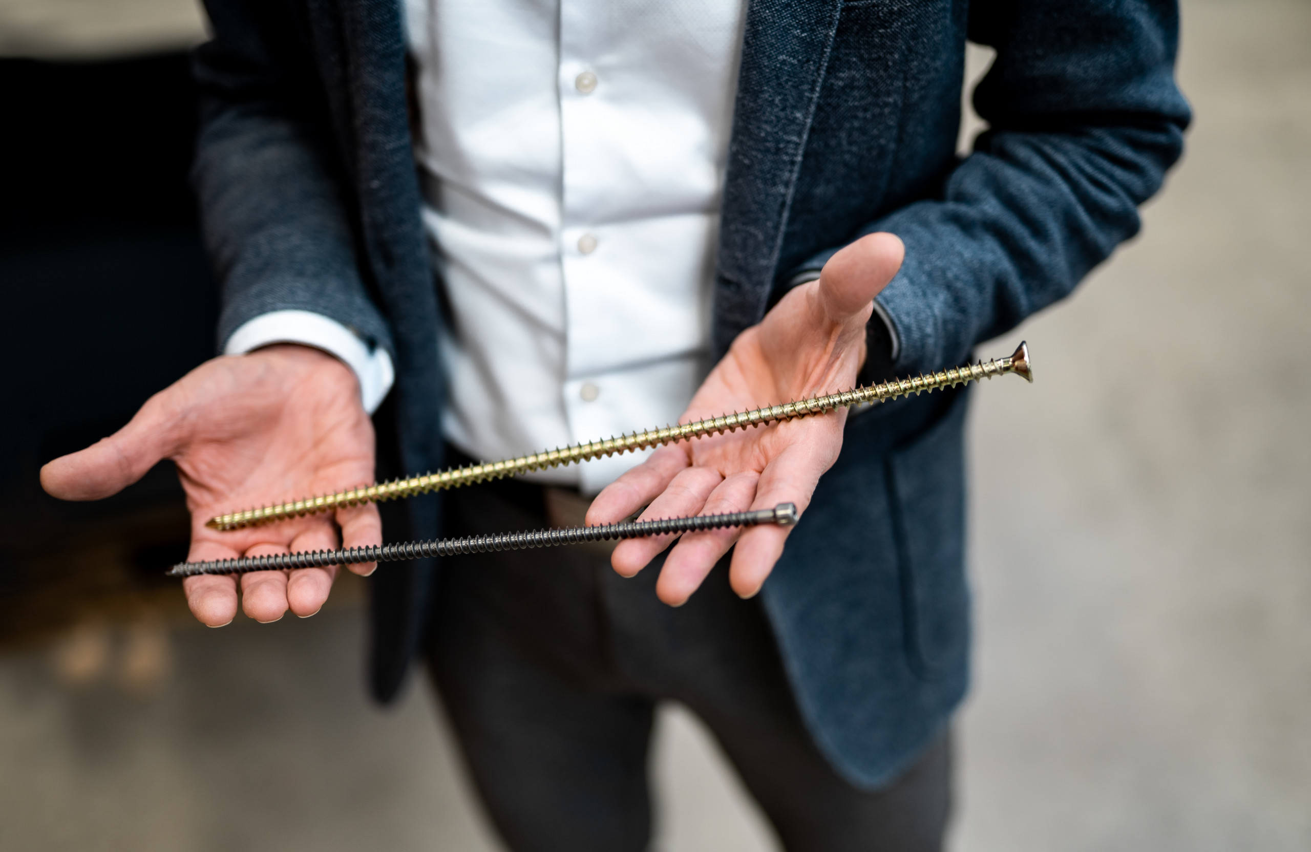 420 mm long fully threaded screws are used in structural timber engineering in increasingly large quantities. The background to this is the current trend for more and more buildings to be constructed in wood. In the south of Germany, this has long been common practice, and more and more buildings are being built of wood in the north as well. The new machine enables screw manufacturers to produce both fully and partially threaded screws at high cycle rates directly from the wire, meeting the growing demands of the market.