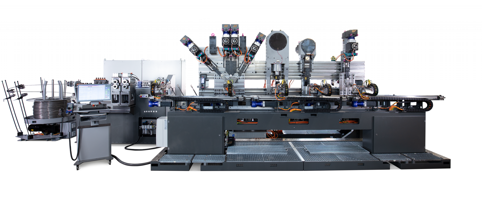 The new Multi-FMU 32 is a modular machine for the production of extension springs with eyelets. The Multi-FMU 32 follows the modular system of the BQ 10, the transfer bending machine for bent wire parts. Once the spring body has been produced using either the coiling or winding process, further bending stations follow to produce the eyelets. These can be arranged flexibly depending on the spring geometry and customer requirements.