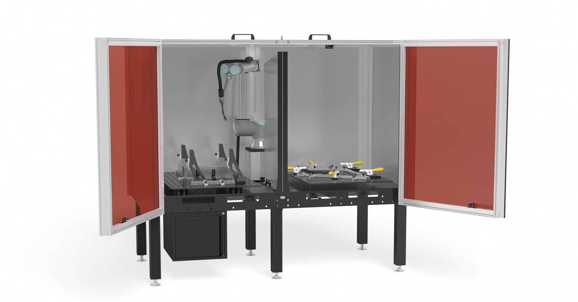 Safety and innovation are also the focus of the new modular laser welding cell. The cell offers protection against scattered radiation and reflections that can occur when working with lasers. Thanks to its innovative design and pre-assembled side panels, it is quickly ready for use. The laser welding cell is suitable for manual laser welding and laser cleaning in the wavelength range from 940 to 1090 nm. Siegmund offers a comprehensive safety concept and presents a cell that has been specially developed for demanding industrial applications.