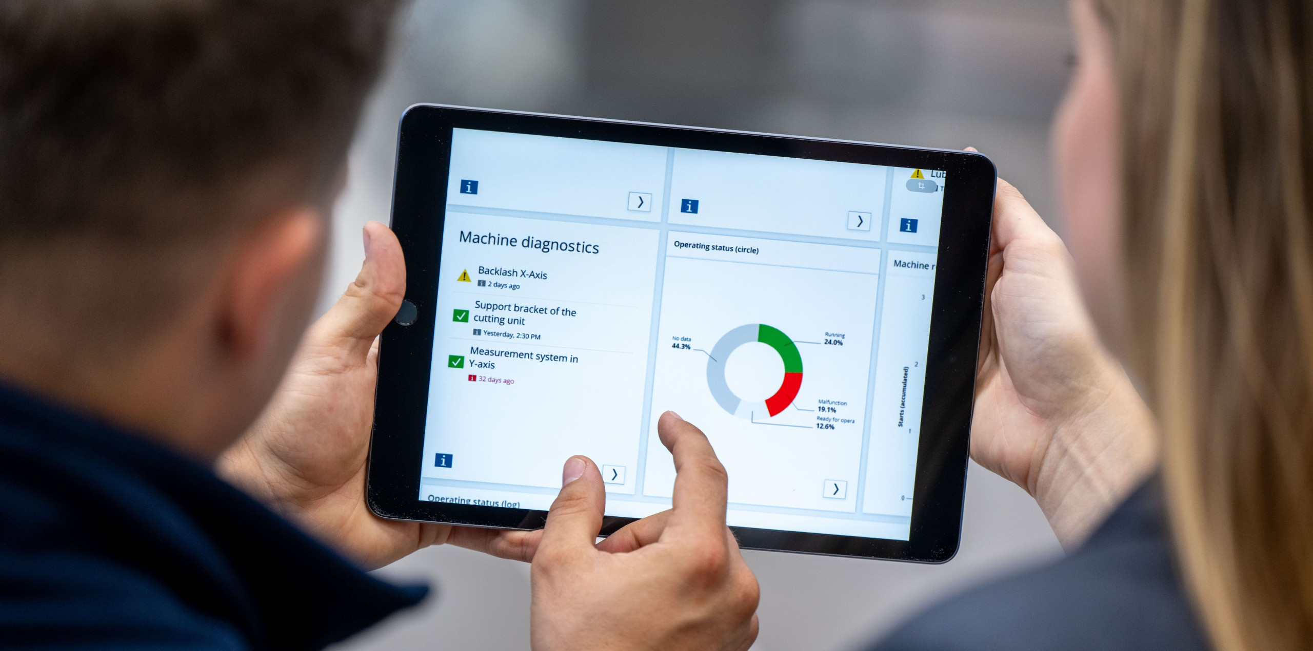 Fixing a problem on the machine before it affects production – this is possible with Trumpf machine diagnostics. Trumpf service experts monitor the condition of the machine remotely (condition monitoring).