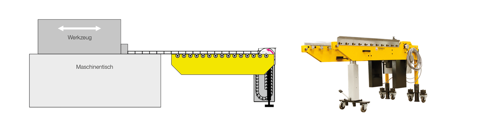 The mold is then placed on the console by forklift or crane. The integrated push chain drive then moves it to its final position in the press via integrated roller and ball bars and positions it there with millimeter precision even against fixed stops.