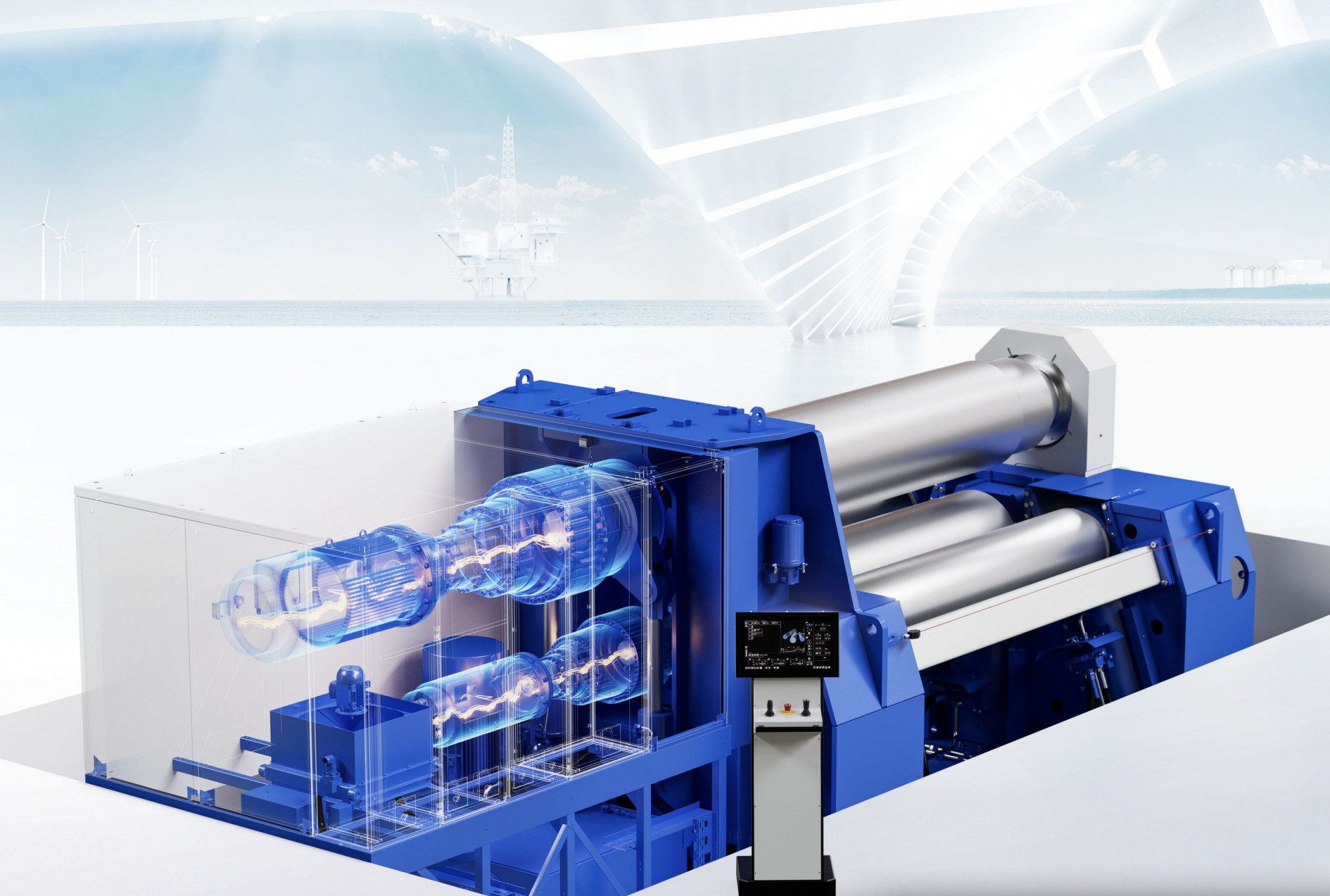 This 4-roll bending machine integrates modern technologies for a wide range of applications – whether wind turbines in onshore and offshore operation, shipbuilding and mechanical engineering or container production, to name just a few examples.