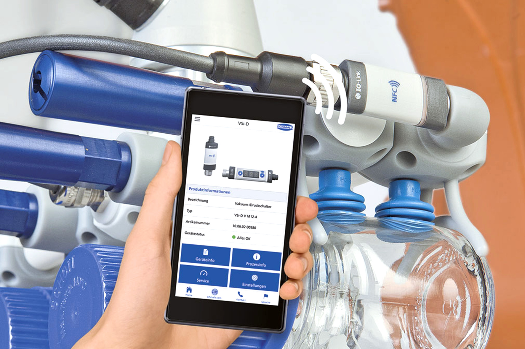 But ControlRoom can do even more: NFC (Near Field Communication) speeds up commissioning and, in the case of intelligent Schmalz field devices, enables real-time data to be recorded and evaluated in the process. The app also displays error messages and warnings and grants access to device settings – either for initial parameterization, subsequent modification or cloning of new components. This makes the efficiency and availability of the plant visible.