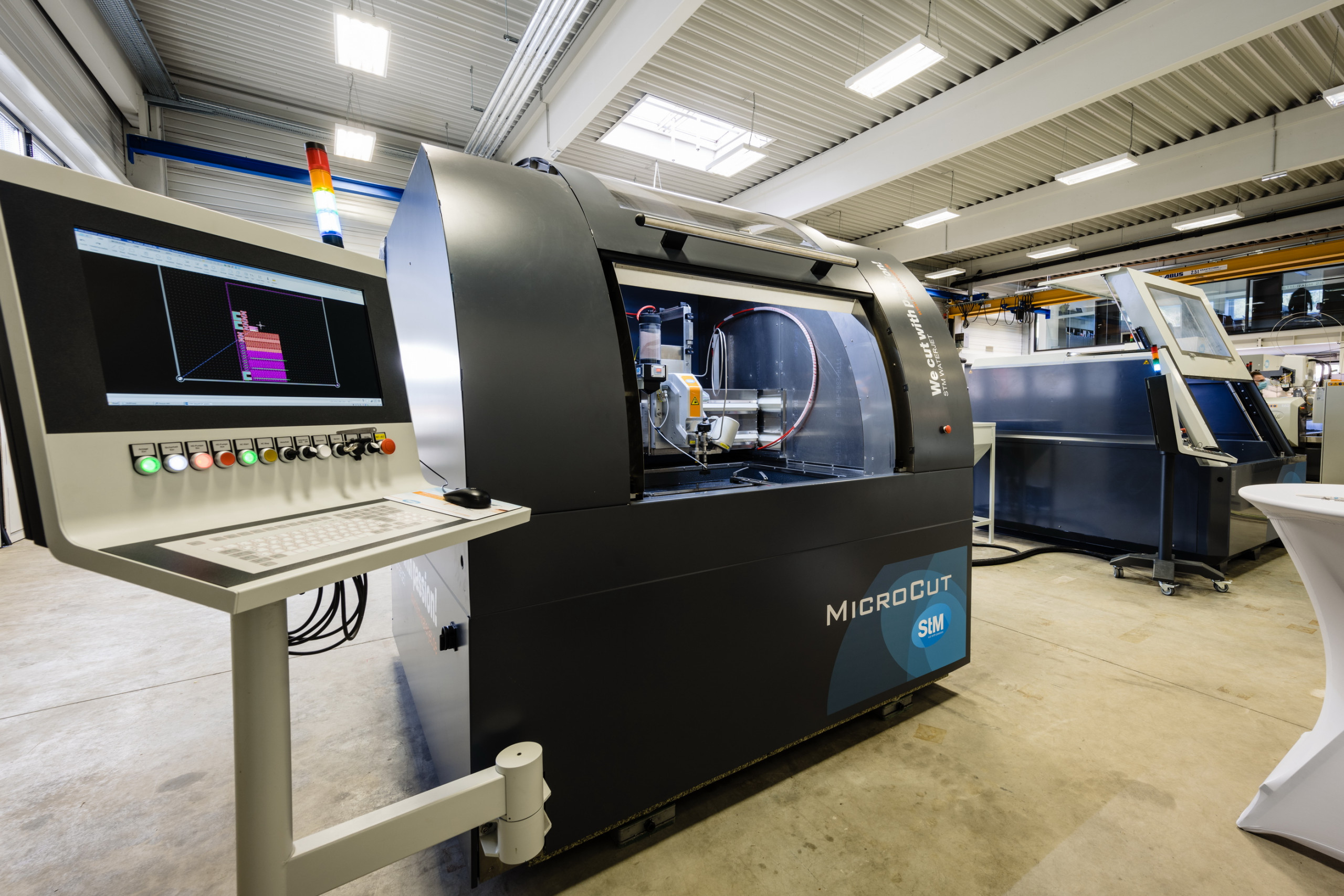 The closed design with motorised safety door ensures maximum safety with minimum operating noise. An efficiently controlled abrasive supply is integrated into the MicroCut, as is a high-precision clamping frame and the highly dynamic CNC. StM also offers all complete packages with an economical high-pressure pump.