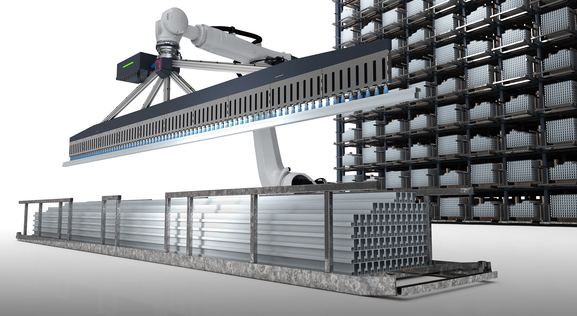 AI-supported image recognition identifies the position of packaged and unpackaged long goods in load carriers. Depending on the application, vacuum, magnetic or gripper tools are used. The system can be fully integrated into Remmert long goods warehouses and is suitable for material provision at production machines or for picking customer orders, among other things.