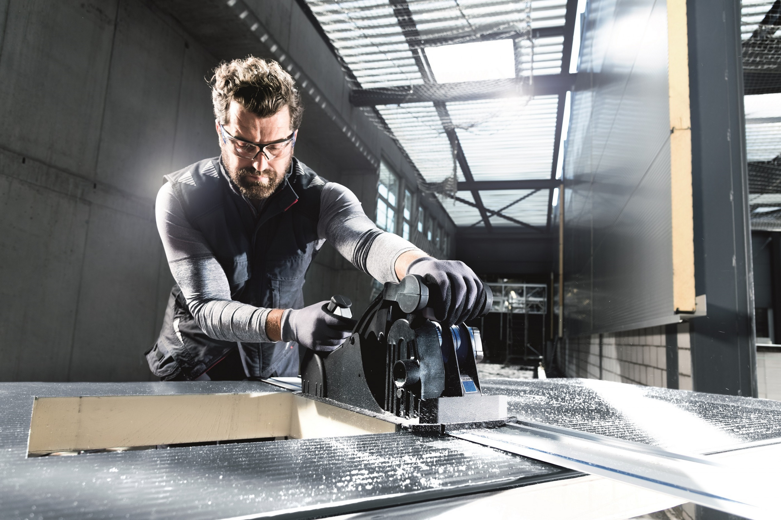 As hall construction professionals confirm, openings for windows and doors in particular, as well as other notches, cannot be produced with comparable quality and speed with any other tool. Since the TPC 165 does not require a starting hole and weighs less than ten kilograms, even subsequent work on panels that have already been installed is possible.