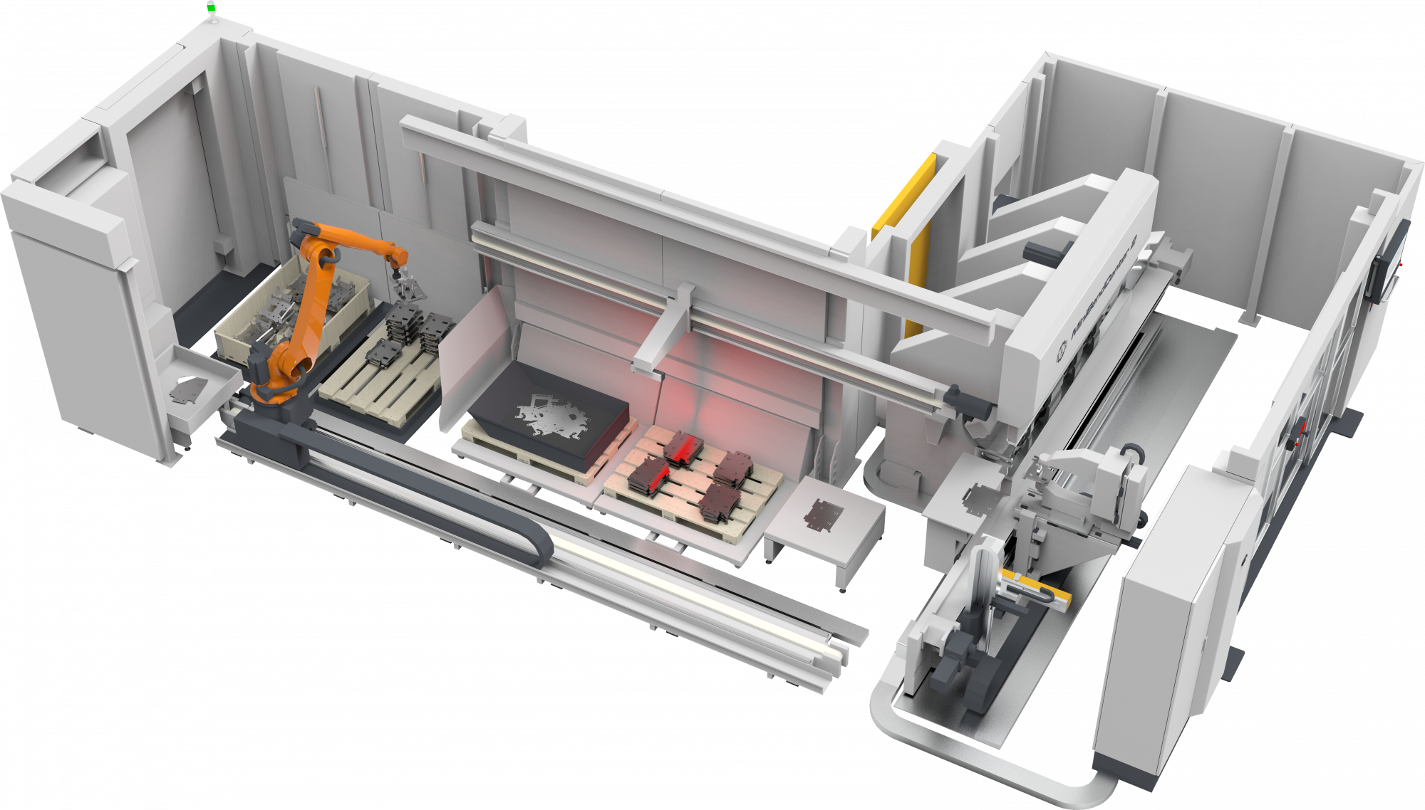 The robot system of the MiniBendCenter 2 takes over both the loading and unloading of the workpieces. With its high-precision servo-electric system, the system sets new standards in terms of efficiency and precision. The vacuum suction cup has four individually controllable suction cups that enable efficient handling of parts from stacks or bulk material. The finished bent parts are palletized in a space-saving and stable manner and pallets can be changed safely and smoothly during operation. Thanks to the seamless integration of the robot into the software, no additional teaching is required.