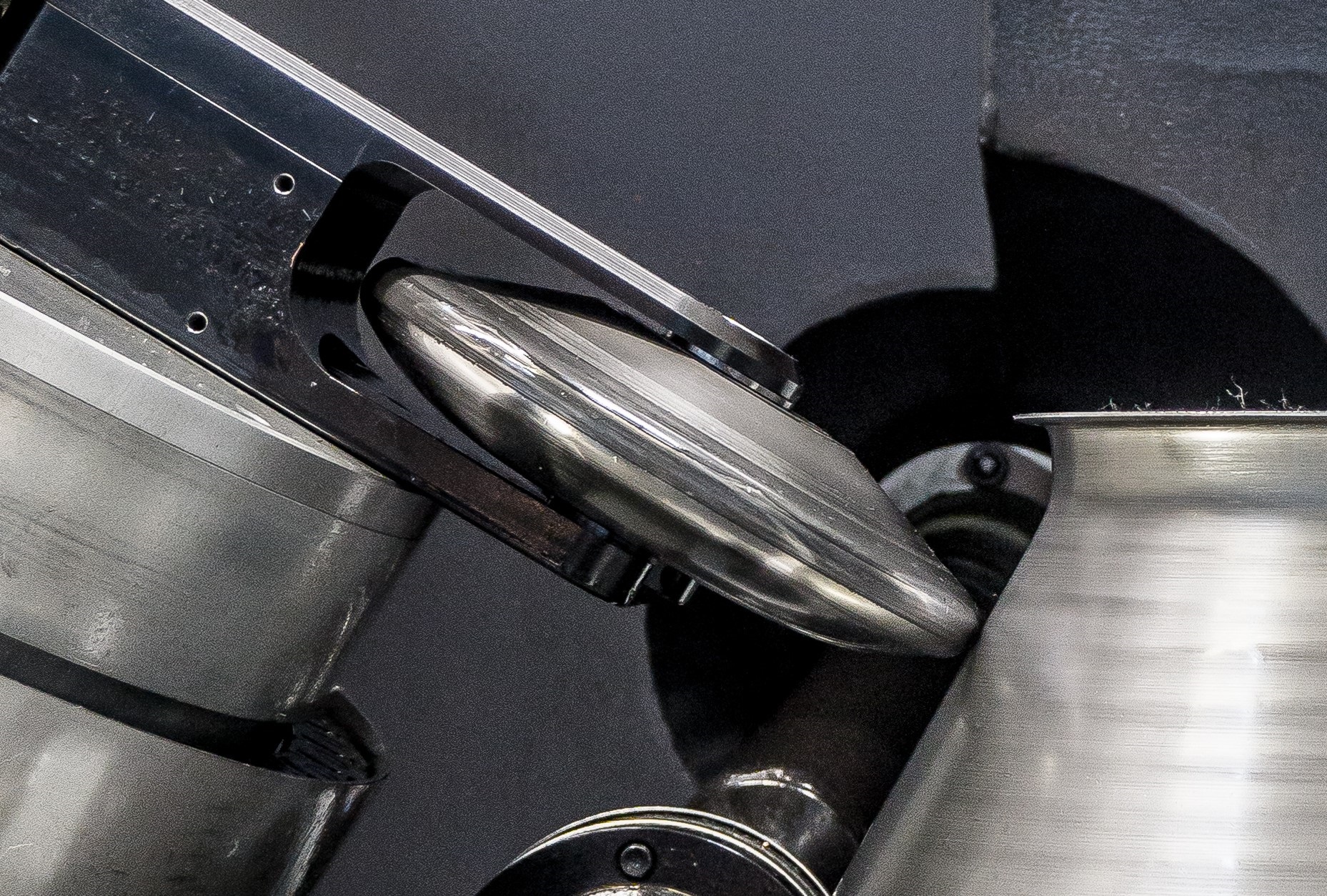 Because the goal today is usually high quantities with absolutely identically reproduced spinning results, CNC machines have long since taken over this work. According to Abacus, this should remain the case. However, with the Premo force feedback control system, the machine builders are now giving their customers and their spinning experts an innovative tool with which they can get back the familiar “feeling element” for the teach-in – i.e. for setting up the machine for the subsequent automated spinning process. For this purpose, the control is equipped with a handwheel that the operator turns to guide the spinning roller toward the workpiece during infeed.