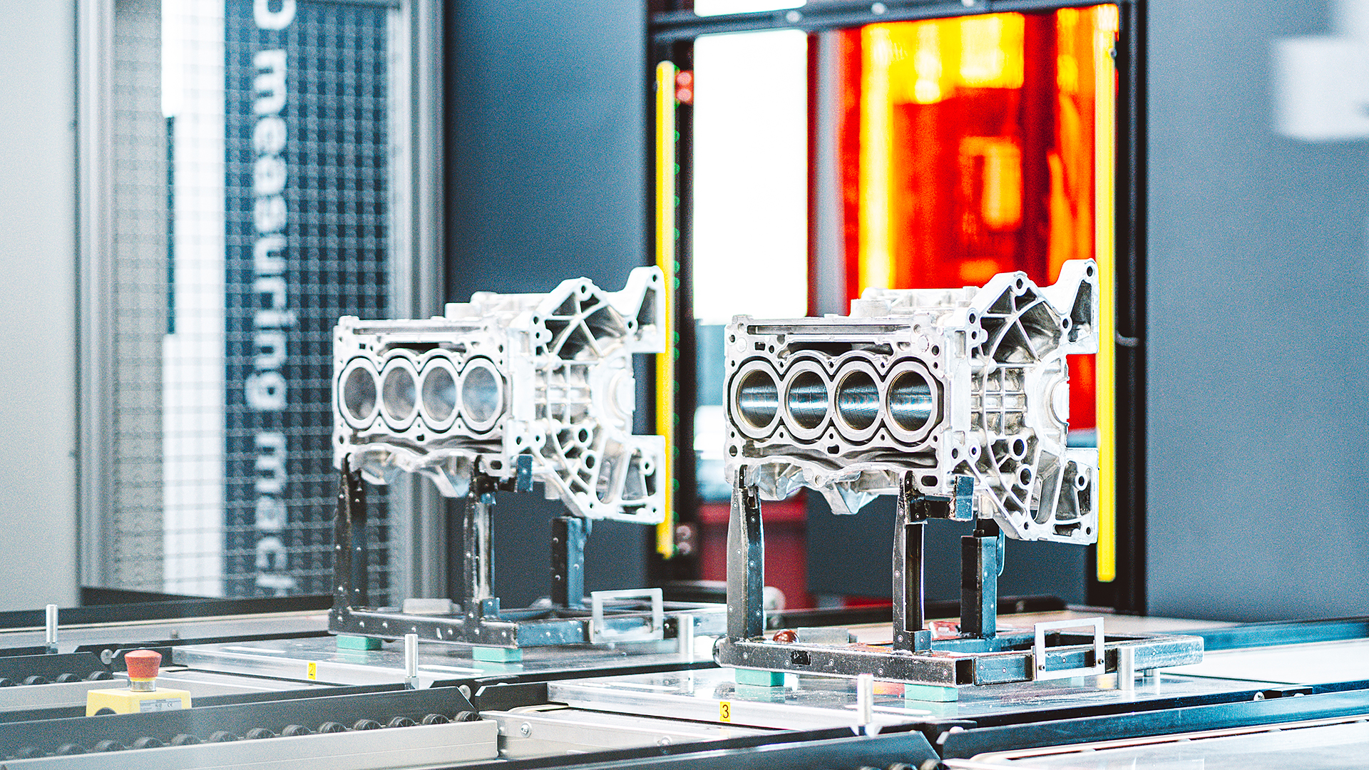 In einem großen Raum der Gießerei liegen die angelieferten Gussteile für die Inspektion bereit. Im ersten Schritt erfolgt eine visuelle Prüfung, dann werden die Bauteile geröntgt. Abschließend vermessen die Mitarbeiter der Qualitätssicherung die Komponenten in einer Anlage mit mehreren KMGs der Zeiss-Prismo-Familie und zusätzlich mit der optischen 3D-Messmaschine Zeiss-ScanBox. „Pro Schicht prüfen wir mindestens ein Bauteil von jeder Druckgussmaschine, das bedeutet 64 oder mehr Prüfungen in einer Acht-Stunden-Periode“, erklärt Gerd Guhde, Planer bei der Qualitätssicherung in der Gießerei.