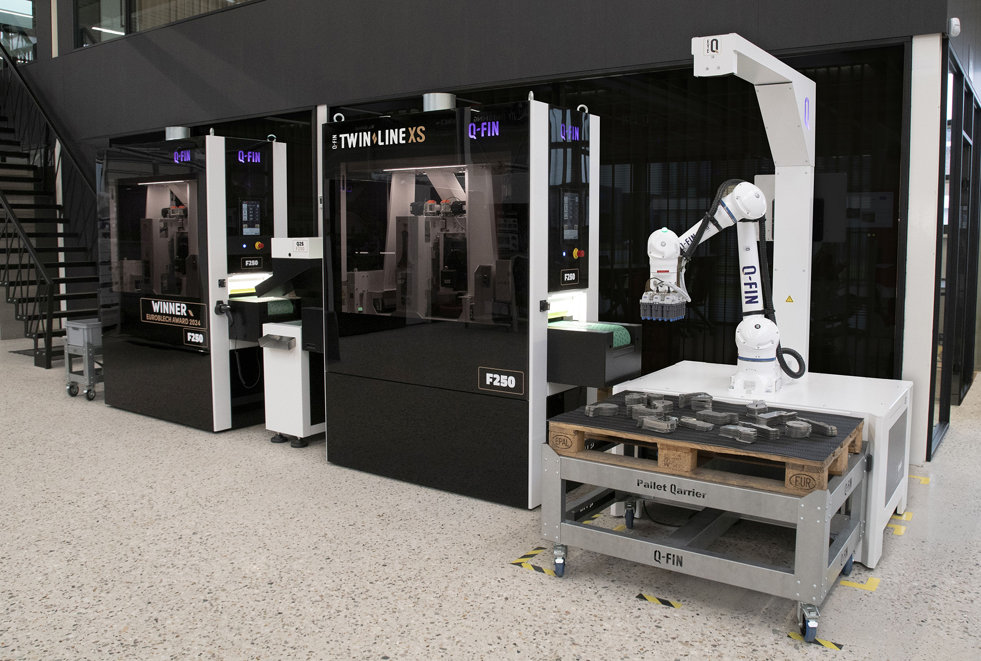 Q-Fin entwickelt, baut und liefert seit 2013 Lösungen für das Entgraten, Verrunden und Finishen von Metallblechteilen inklusive umfassender Handlingslösungen zur Leistungssteigerung von Finishingmaschinen. So wurden Transportbänder für einen nahtlosen Materialfluss, Cobots und Roboter für präzises automatisiertes Handling und eine vielseitige Wendestation zur Workflow-Optimierung entwickelt, um den Finishingprozess zu verschlanken, die Lohnkosten zu senken und eine konstante Qualität zu gewährleisten.