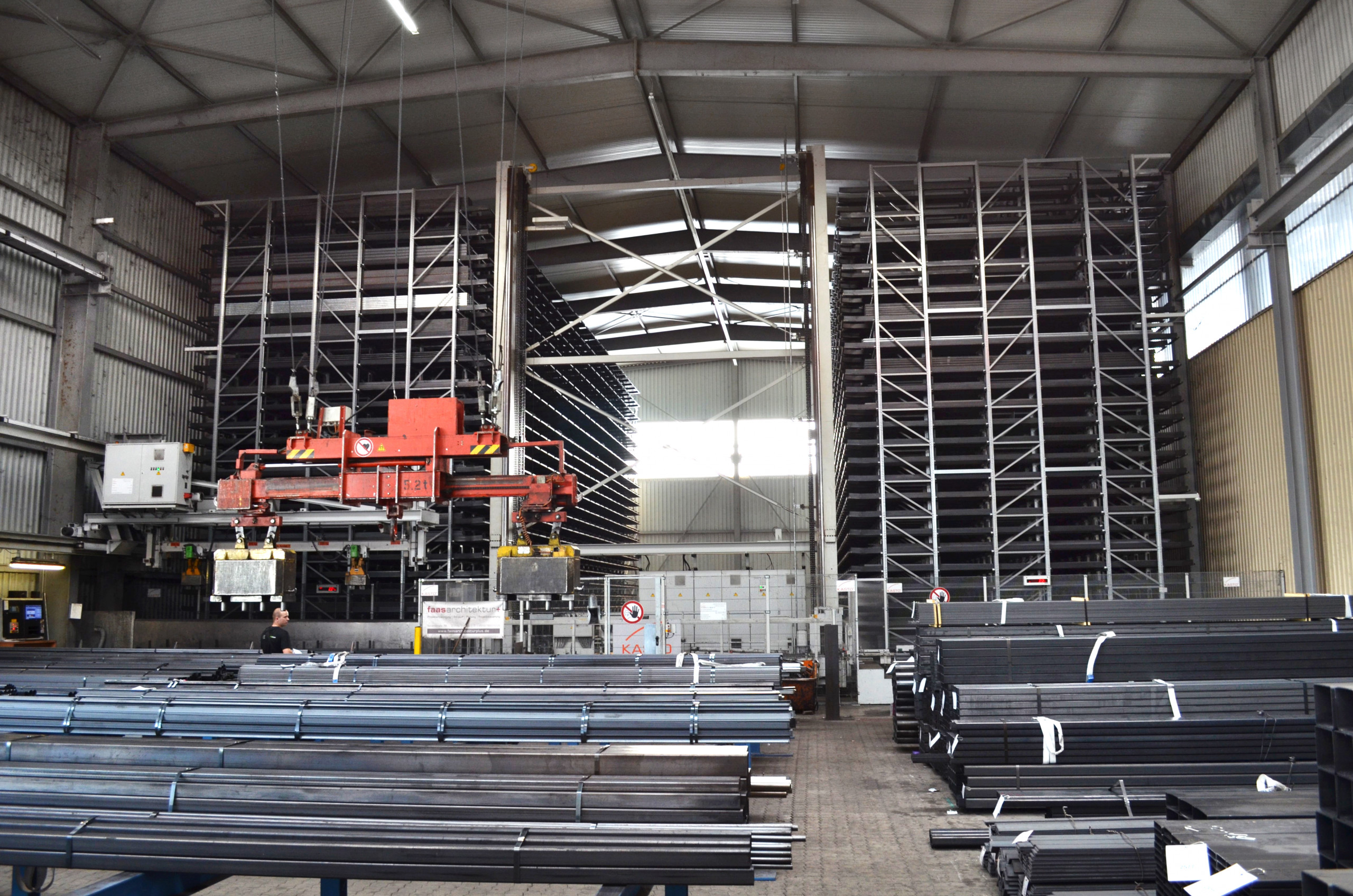 Handelt es sich um Langgut, stellt das Kasto-System mit einem Regalbediengerät (RBG) die benötigten Artikel mit kurzen Zugriffszeiten nach dem Prinzip „Ware-zum-Mann“ an einer von zwei Auslagerstationen bereit. Bleche hingegen bewahrt das Unternehmen in einem separaten, manuell bedienten Lagerbereich auf.
