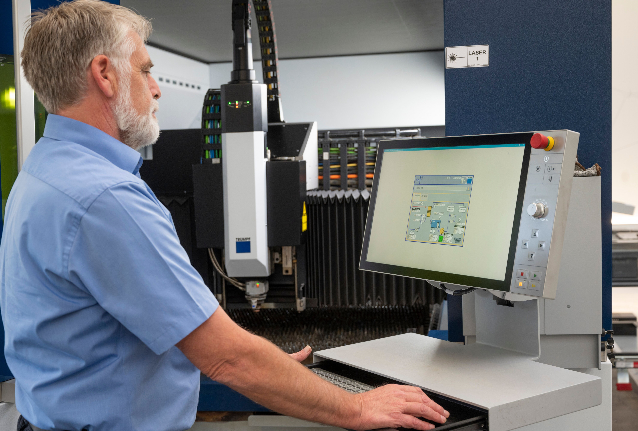Herkömmliche Kühlsysteme arbeiten mit chemischen Kältemitteln, sogenannten F-Gasen (Fluorinated gases). Der Kühlvorgang verbraucht viel Energie, außerdem belasten die F-Gase bei ihrer Entsorgung die Umwelt. Der Eco Cooler von Trumpf kühlt die Laserschneidmaschine mit reinem Wasser. Zudem spart er bis zu 80 Prozent Energie für die Kälteerzeugung und verzichtet komplett auf Schadstoffe.