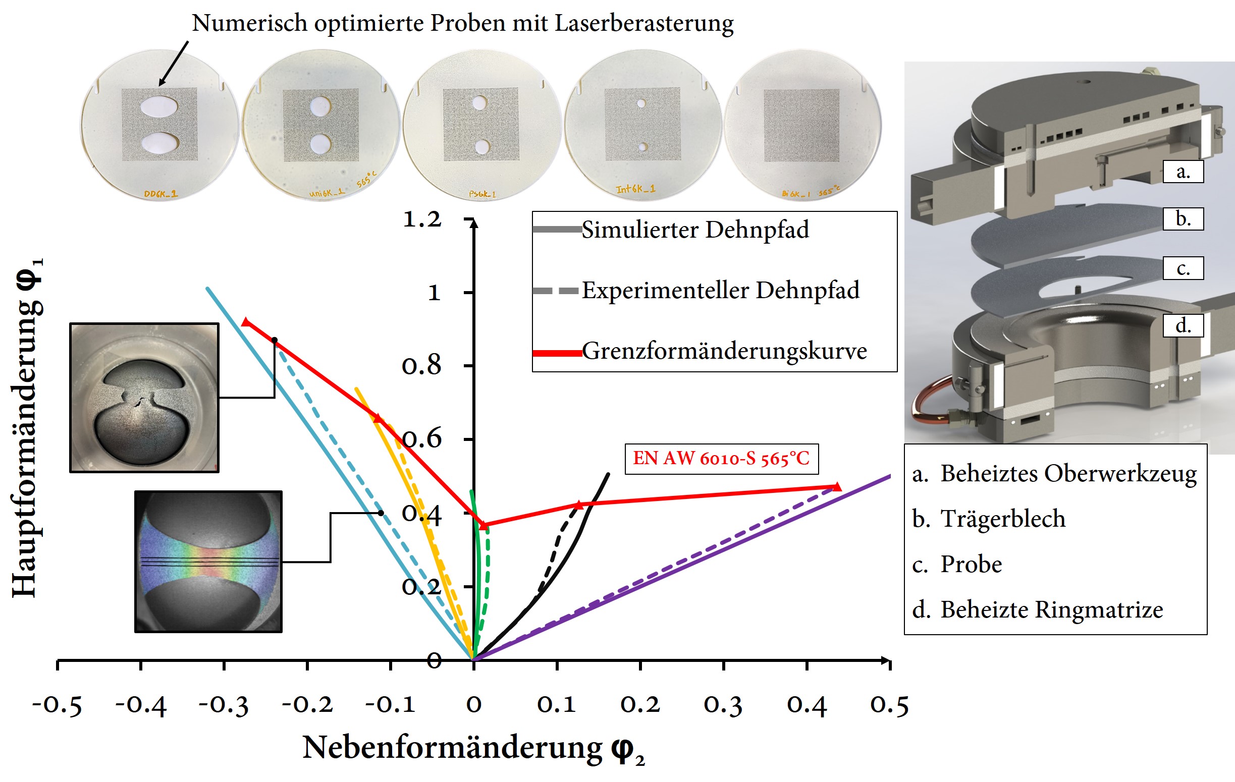 In Zusammenarbeit des Unternehmens Dirkra und den Instituten für fluidtechnische Antriebe und Systeme sowie für Bildsame Formgebung der RWTH Aachen University wurde ein Prüfkonzept entwickelt, das die Ermittlung von Fließkurven und Grenzformänderung von Aluminiumblechen unter Warmumformbedingungen ermöglicht.