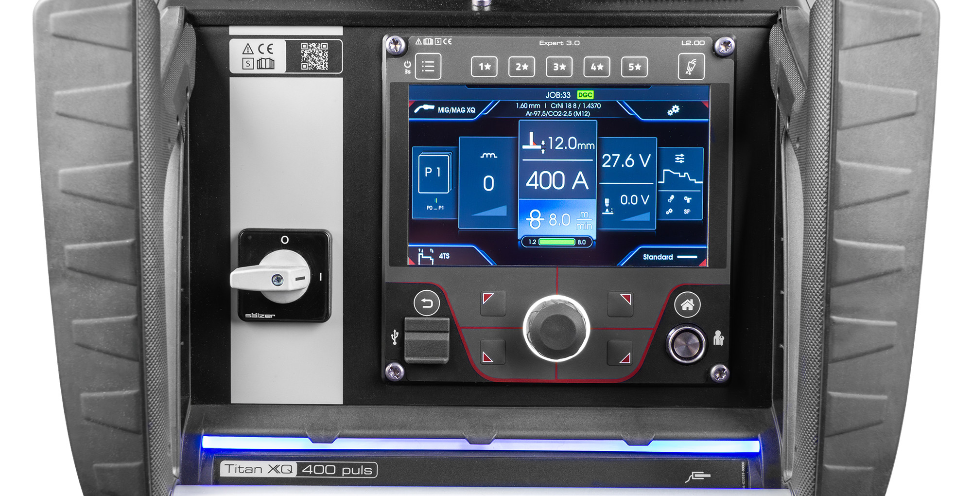 Wichtige Funktionen im direkten Zugriff und alle Parameter im Blick – die neue Steuerung Expert 3.0 bietet eine wirksame Unterstützung bei zahlreichen Schweißaufgaben. Sie ist kompatibel mit allen XQ-Stromquellen im FlexFit-Gehäuse (Titan XQ, Phoenix XQ und Taurus XQ) und den modularen, dekompakten Stromquellen Phoenix XQ und Taurus XQ. Die Steuerung punktet durch ihre Benutzerfreundlichkeit. Dazu gehört das große Display mit Farbbild und Grafikunterstützung zur Anzeige wichtiger Parameter und Schweißabläufe. Die Parameter sind dabei stufenlos über ein Click-Wheel einstellbar. Somit kann die Steuerung selbst mit Schweißerhandschuhen bedient werden. Mithilfe der fünf Favoritentasten lassen sich wiederkehrende Anwendungskombinationen einfach abspeichern. Die Farbcodierung zeigt dabei den jeweiligen Status an.
