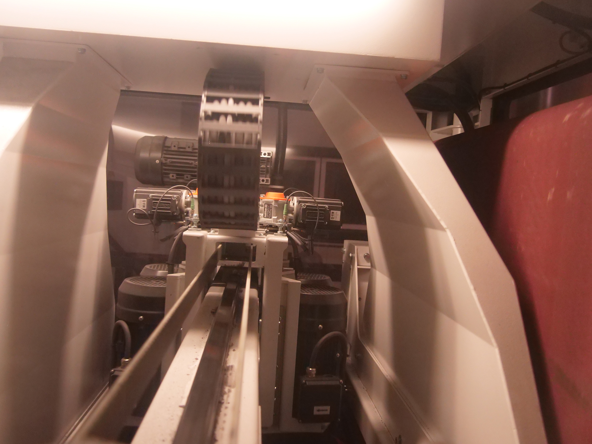 Die Maschine ist an ein WES6000-Nassfiltersystem gekoppelt. Es scheidet Schleifstaub im Wasser ab und verhindert damit Brand- und Explosionsrisiken. Bei einer Luftleistung von 6000 m³/h und einem Wasserverbrauch von rund 7 l/h wird kein Filtermaterial benötigt; die abgetrennten Späne lassen sich dem Recycling zuführen.