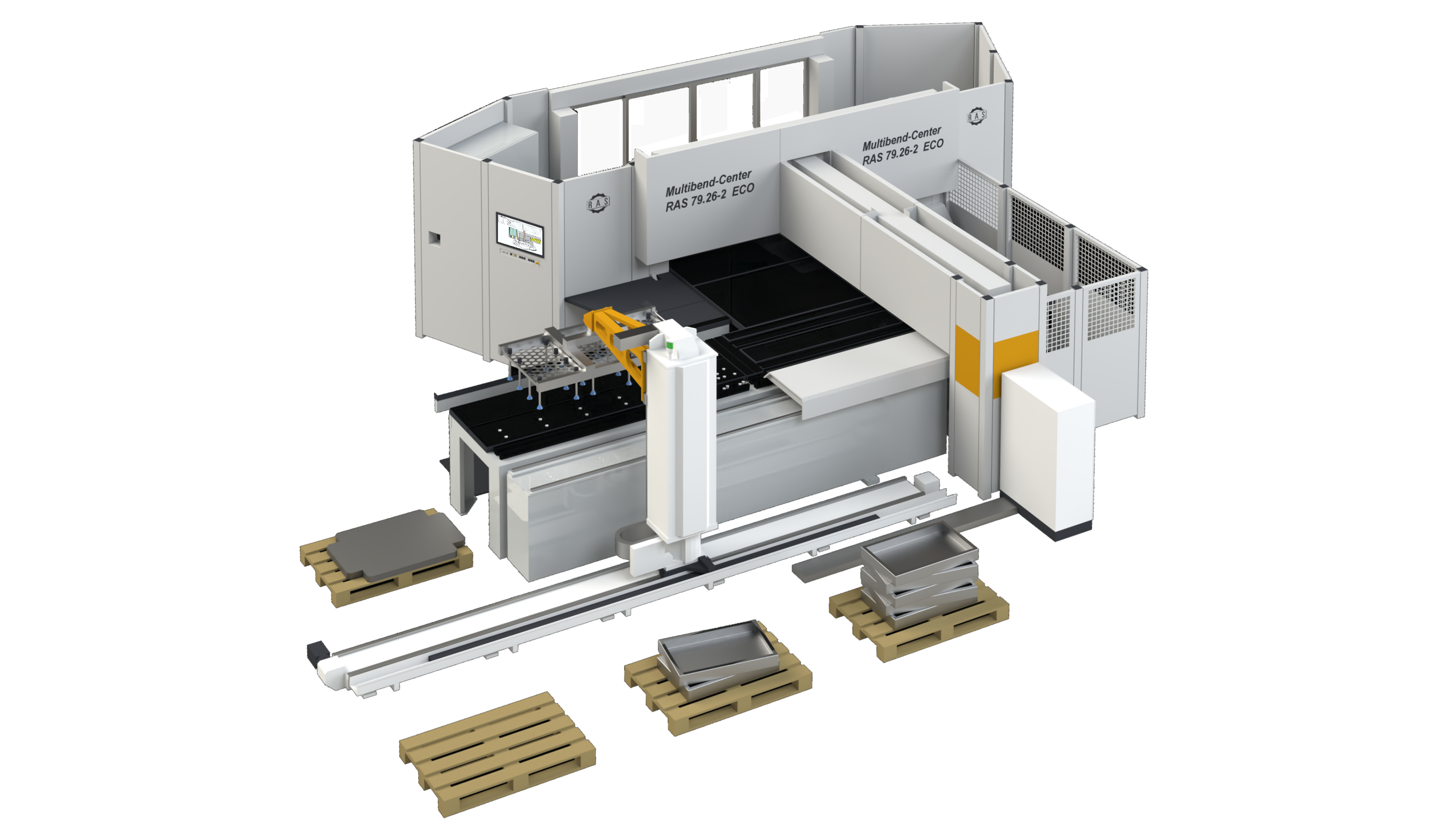 Nachdem das RAS Multibend-Center Eco als günstige Einsteigerlösung ins automatische Biegen seine Fangemeinde gefunden hatte, kam schnell der Wunsch nach einer einfachen Automatisierung beim Beladen von Platinen und Stapeln der fertigen Biegeteile auf. Hier lautet die Lösung Multibend-Center Ecoauto mit 2560 mm Biegelänge. Die kompakte Bauweise erfordert lediglich eine Hallenfläche von 8950 x 10900 mm.