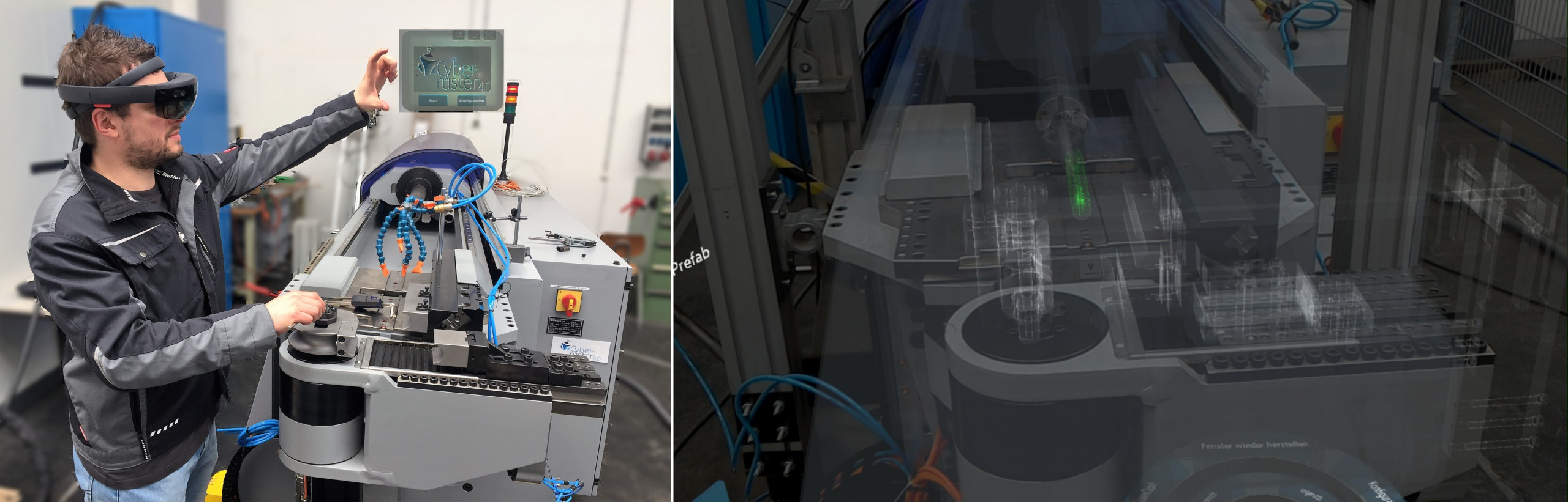 Im durch EFRE (2016 bis 2019) geförderten Forschungsvorhaben „Cyberrüsten 4.0 – Cyber-physische Unterstützung des Menschen beim Rüstvorgang am Beispiel eines Biegeprozesses zur Kleinserienfertigung auf Basis eines Wissenstransferansatzes“ konnte mittels AR (Augmented Reality) eine Unterstützung für den Rüst- und Einstellprozess einer Biegemaschine realisiert werden. Hierfür wurde eine HoloLens von Microsoft verwendet, die dem jeweiligen „Bediener“ für jeden Rüst- oder Einstellschritt die erforderlichen Informationen zur Verfügung stellt. Konkret werden die jeweils relevanten Werkzeuge, deren derzeitige und geplante Positionen, etwaige erforderliche Hilfsmittel sowie die durchzuführenden Handlungen über die AR-Brille eingeblendet. Als Möglichkeiten zur Einblendung stehen Bilder und Videos, aber auch holografische Projektionen zur Verfügung. Bedingt durch die Flexibilität der Anwendung können die Art der Darstellung und deren Inhalt frei konfiguriert werden. Die Anwendung kann Rüstzeiten verringern und Ausschuss in Folge fehlerhaft montierter oder eingestellter Werkzeuge vermeiden.
