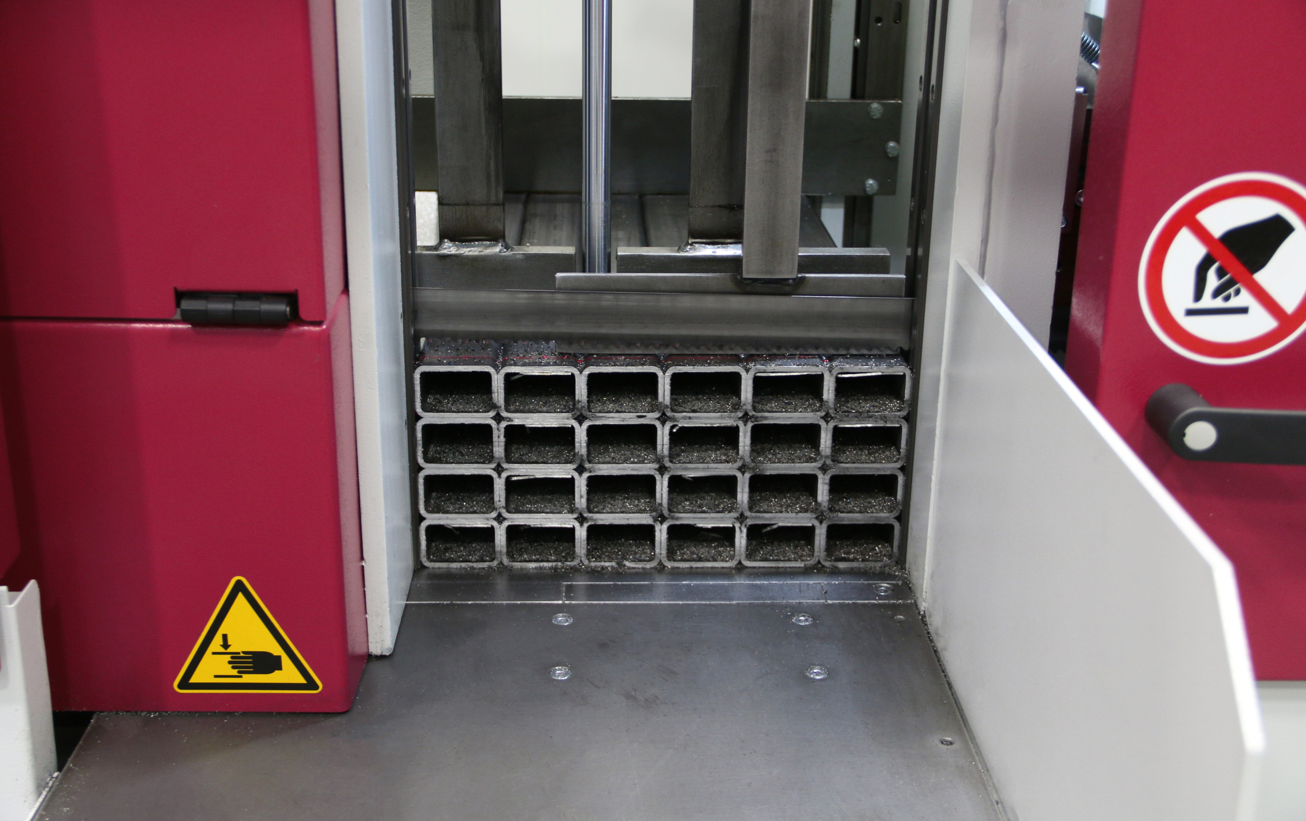 Serienmäßig ist ebenfalls ein Doppelspannstock, der das Material auf beiden Seiten des Schnittkanals sicher spannt. Dies begünstigt die Präzision des Sägeschnitts durch die bessere Ausrichtung des Materials. Insbesondere Materialbündel und Lagen, aber auch dünnwandige Rohre werden so optimal fixiert.