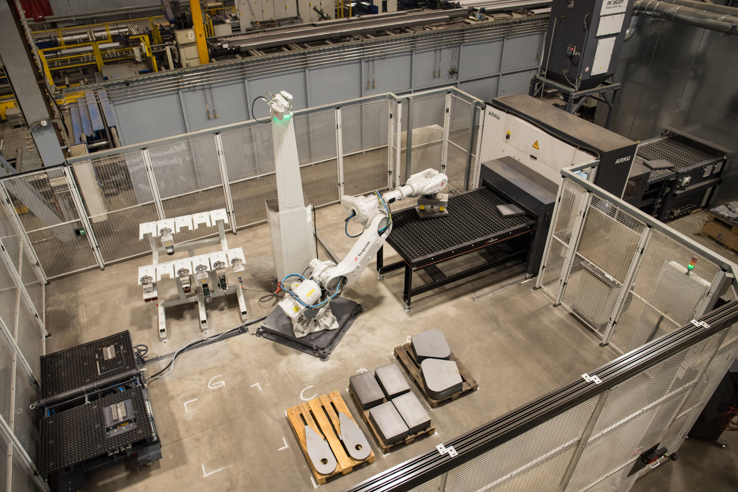 Die Robotersysteme mit verschiedenen Greifern stammen vom niederländischen Experten Teqram B.V. Mit intelligenten Kameras ausgestattet können die „EasyBots“ Teile in ihrem Arbeitsbereich selbstständig und unabhängig von deren Position auf der Palette erkennen. Dadurch entfällt das sonst übliche, zeitaufwendige Teachen (Einlernen) oder Programmieren des Roboters. Für Teile, die für die Linie zu dick sind, bieten die Roboter die Möglichkeit, diese automatisiert mit Handwerkzeugen zu bearbeiten. Die Roboter können auf verschiedene Werkzeuge wie Meißel und Winkelschleifer zugreifen und mit ihrer fortschrittlichen Kamera- und Sensortechnik die Teile perfekt verputzen.